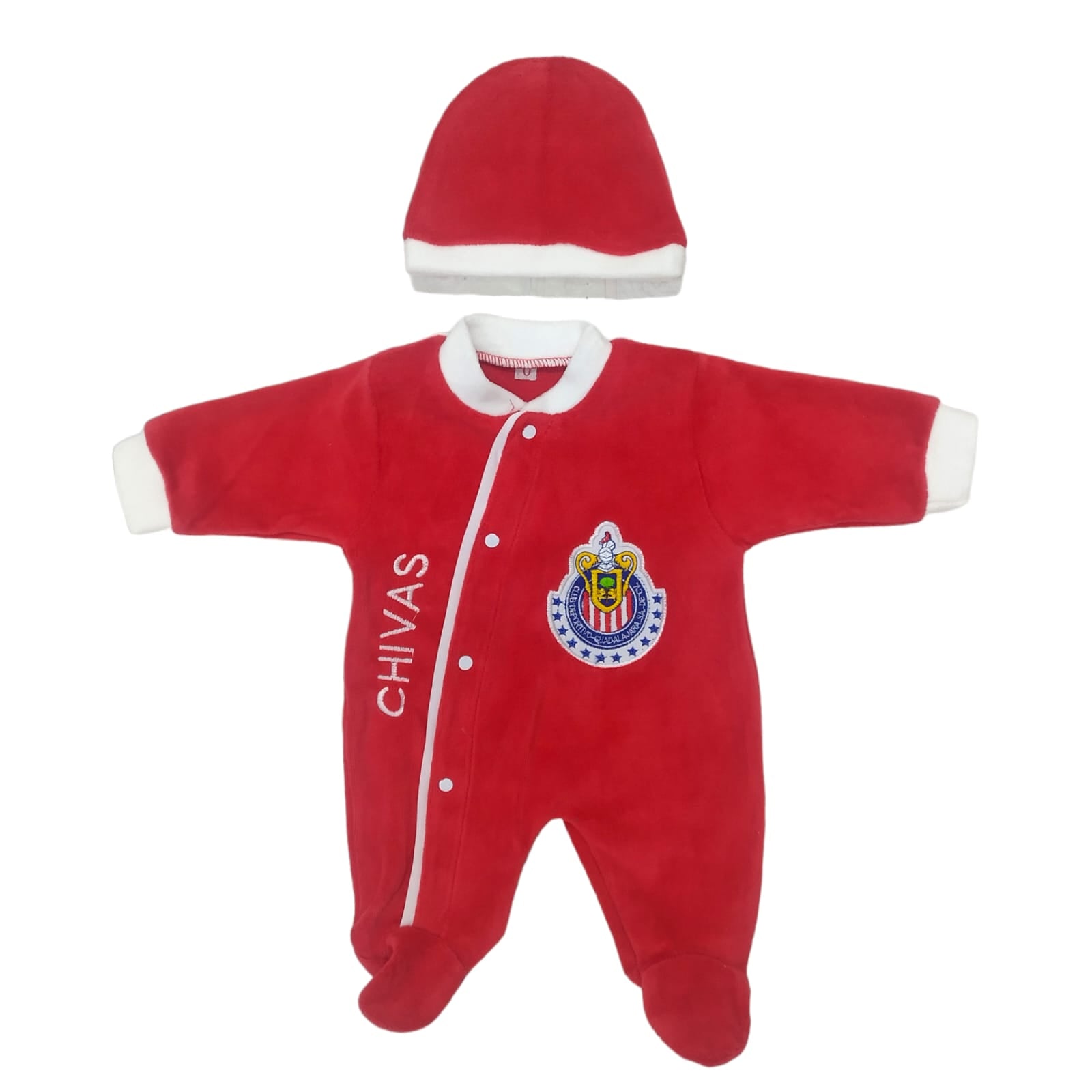 Confeccionado con materiales hipoalergénicos y de alta calidad, cuenta con el icónico escudo bordado del Club Chivas, para que tu pequeño luzca con orgullo los colores rojiblancos desde sus primeros días.